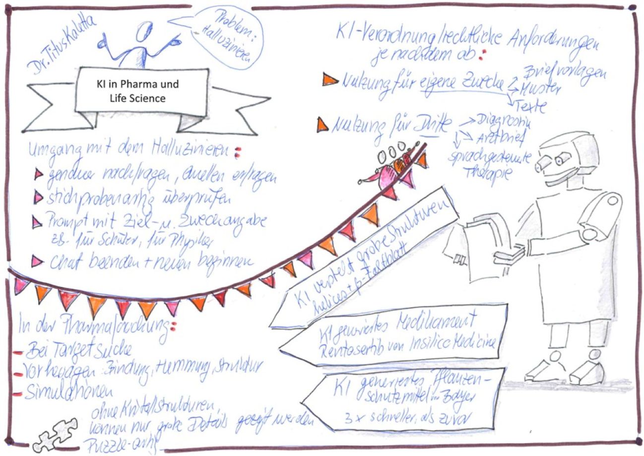 In der Pharmaforschung werde KI bereits seit über 10 Jahren erfolgreich eingesetzt, so Dr. Kaletta insbesondere bei der Targetsuche, bei verschiedenen Simulationen und Vorhersagen, oder wenn es um die Verarbeitung von großen Datenmengen geht. Allgemein werden bessere Ergebnisse durch die KI erzielt, je mehr Daten die KI-Modelle zum lernen erhielten. Dies wird beispielsweise bei Strukturvorhersagen deutlich, die oft nur grobe Skizzen sind. Dr. Kaletta berichtete auch vom Medikament Rentosertib (auch bekannt als ISM001-055). Es ist das erste Medikament, das vollständig durch KI entwickelt wurde, wobei sowohl das biologische Zielmolekül als auch der Wirkstoff durch KI identifiziert und entworfen wurden. Rentosertib ist ein Prüfpräparat zur Behandlung der idiopathischen Lungenfibrose (IPF), einer schweren und tödlichen Lungenerkrankung, die zu fortschreitender Vernarbung der Lunge führt. Hier hemmt es das Enzym TNIK (TRAF2- und NCK-interagierende Kinase), welches eine Schlüsselrolle bei der Fibrose spielt und so möglicherweise die Lungenfunktion verbessern kann.