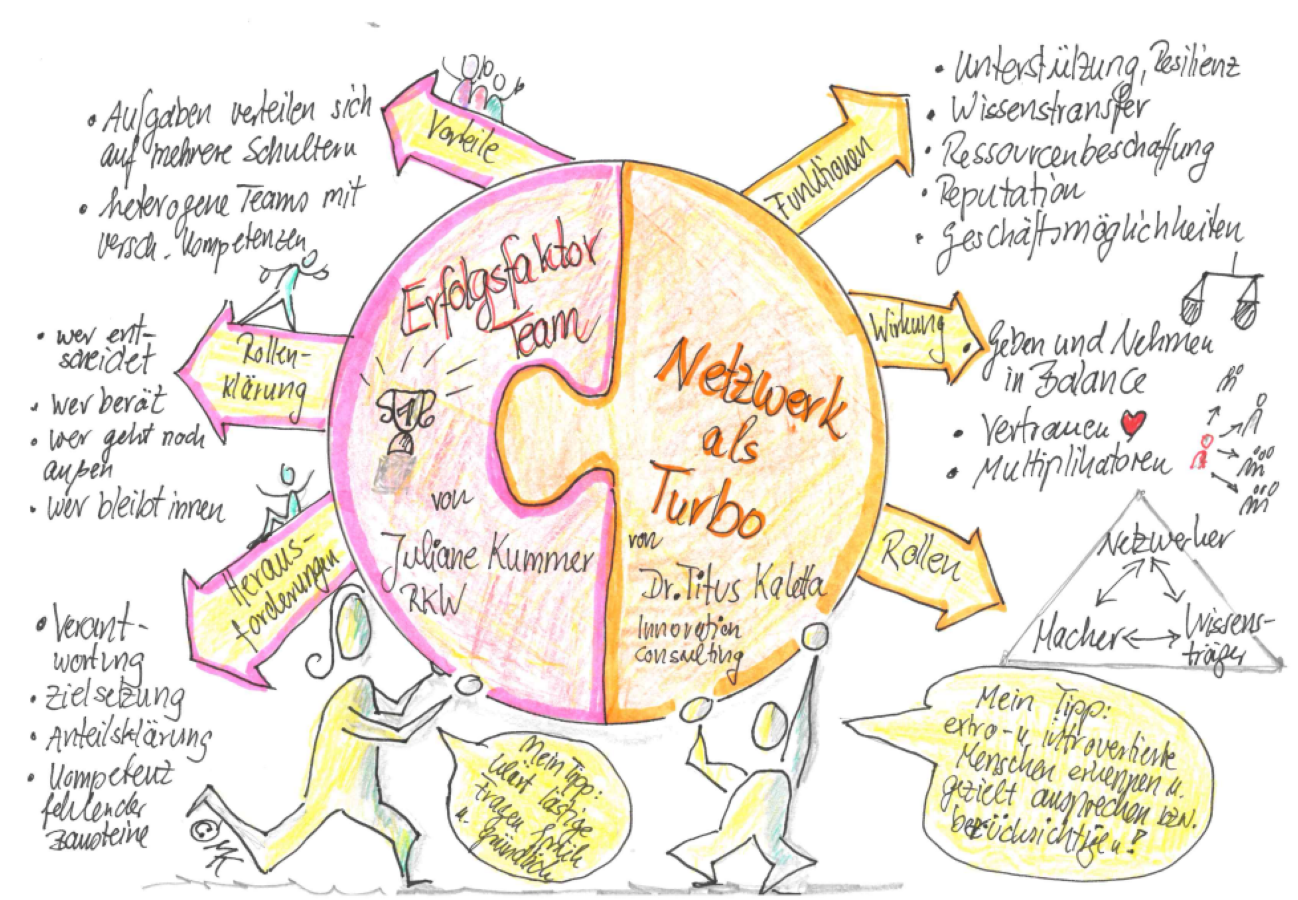 Den ersten Vortrag übernahm Frau Juliane Kummer vom RKW Kompetenzzentrum in Eschborn und referierte als Expertin mit langjähriger Erfahrung in der Begleitung von Gründungen zum Thema „Team“. Sie ging dabei auf die Vorteile eines möglichst vielseitigen Gründerteams ein, das die zahlreichen verschiedenen Aufgaben auf mehrere Schultern verteilen kann und dadurch resilienter ist. Ihr war eine sorgfältige Rollenklärung der Teammitglieder sehr wichtig und sie betonte, dass auch unangenehme oder lästige Aspekte frühzeitig und abschließend geklärt werden sollten, um später im Geschehen Unstimmigkeiten zu vermeiden.  Frau Kummer ließ die Teilnehmenden an ihrem reichhaltigen Erfahrungsschatz teilhaben, beantwortete alle Fragen und vermied es auch nicht, auf mögliche Herausforderungen und Probleme einzugehen, die sie selber erlebt oder erfahren hat. So bedarf es besonderer Aufmerksamkeit, die Verantwortungen und Anteile zu vergeben, die jeweiligen Teilziele festzulegen, die Kompetenzlücken im Gründerteam zu schließen und ein belastbares Netzwerk aufzubauen.